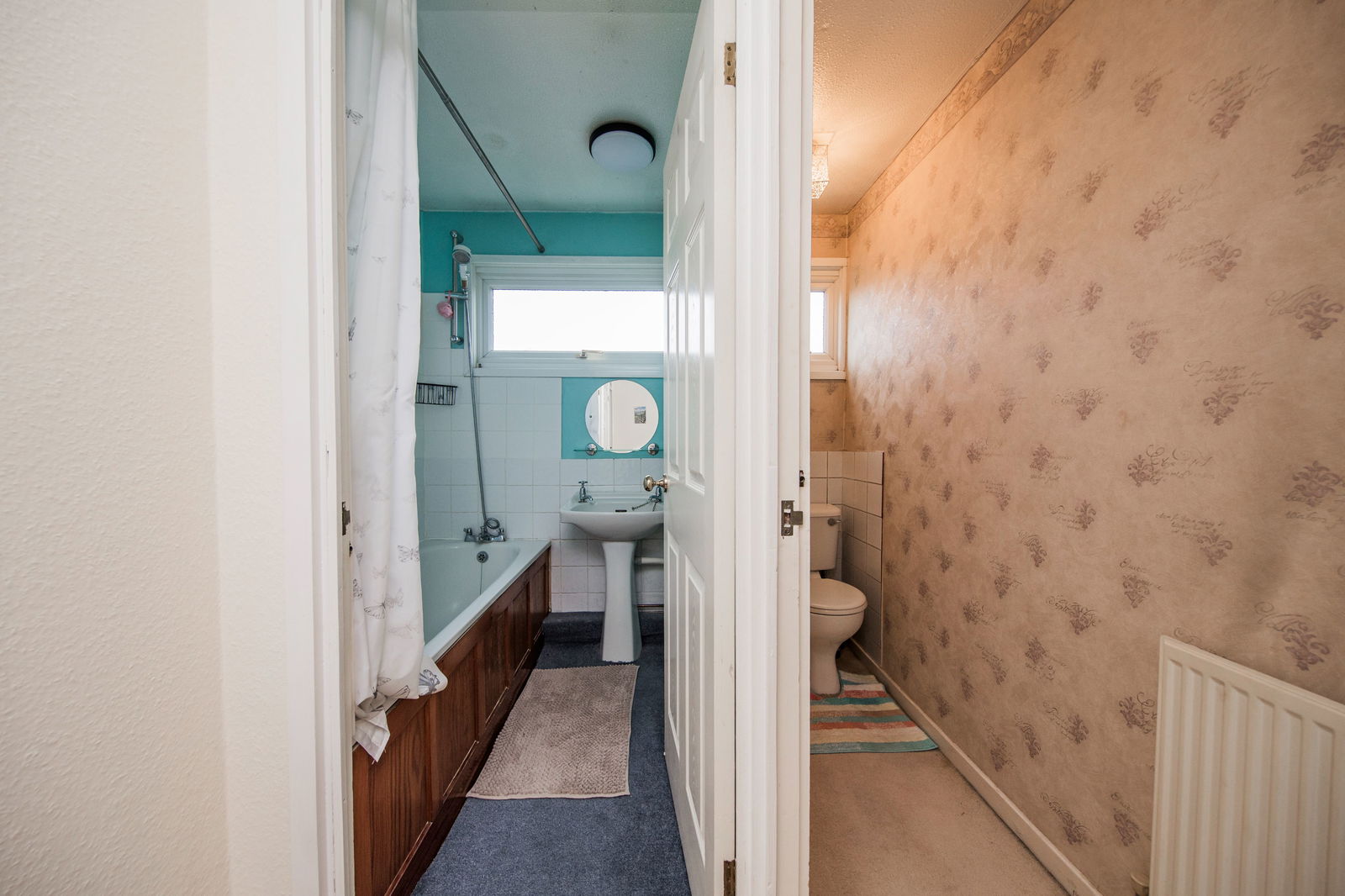Frosted window, WC, carpeted, radiator.