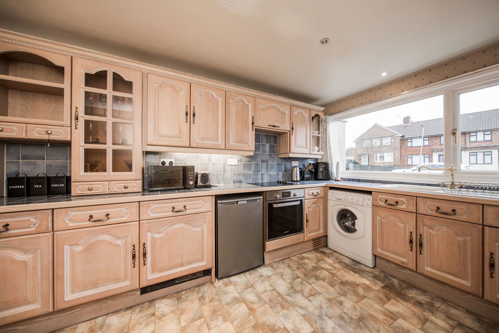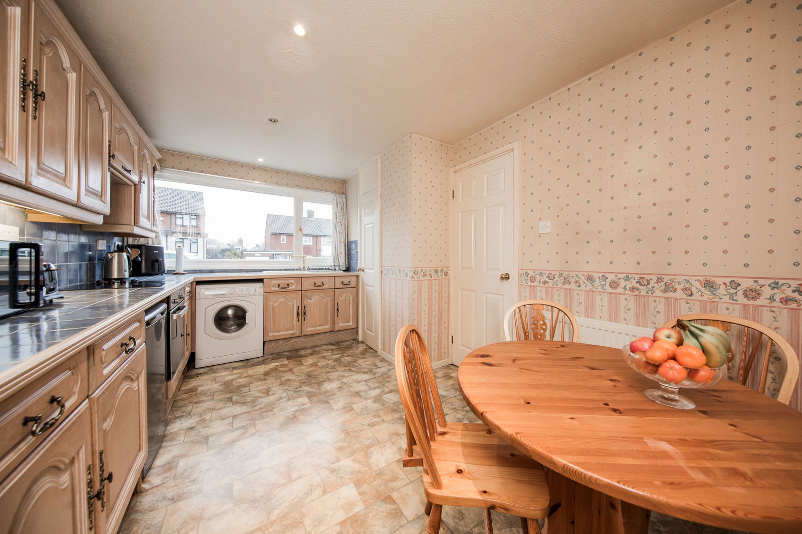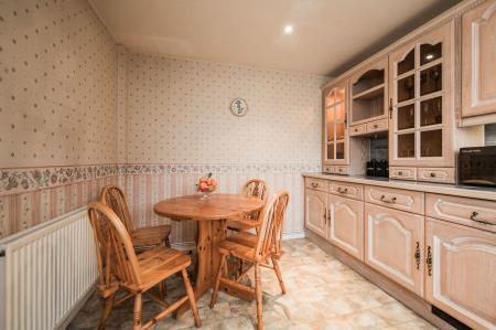Wide window, plenty of wall and floor cabinets, tiled worksurfaces, fitted fan oven, four ring electric hob, sink and drainer, integral freezer, space for fridge and washing machine, space for table and chairs, laminate flooring, radiator.