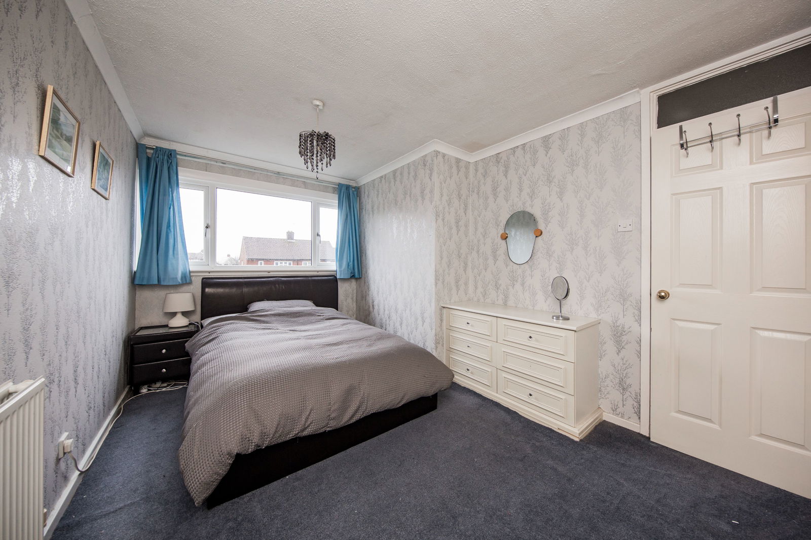 A light and airy small double or large single, wide window, space for bedroom furniture, carpeted, radiator.