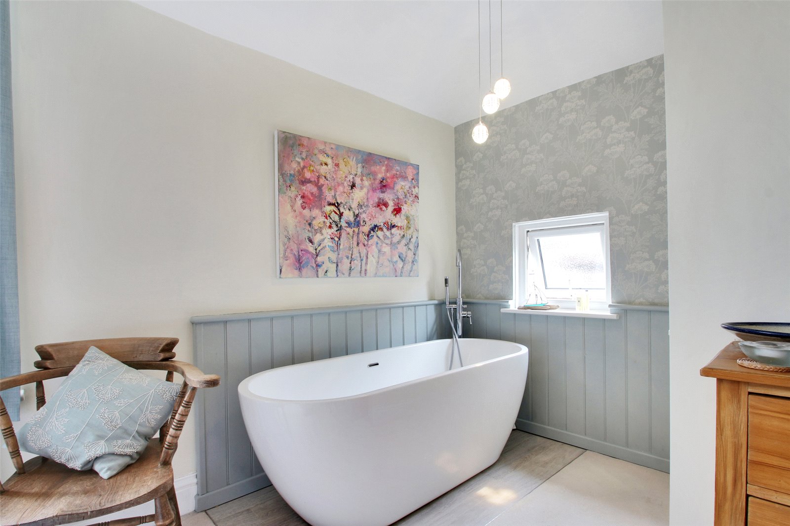 To the first floor is master bedroom with contemporary roll top bath, two further bedrooms and shower room wc.