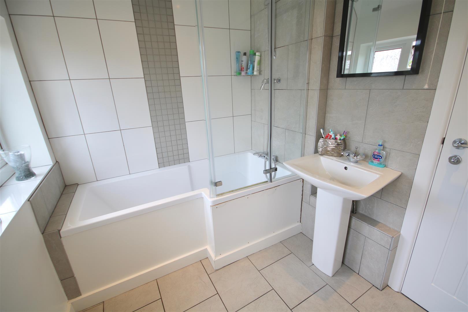 Bathroom - 3.48m x 1.85m (11'5" x 6'1") - Tile flooring and splash backs, heated towel rail, extractor fan, spotlights smooth ceilings and walls, panel bath with shower, 3 x UPVC double glazed window to rear elevation