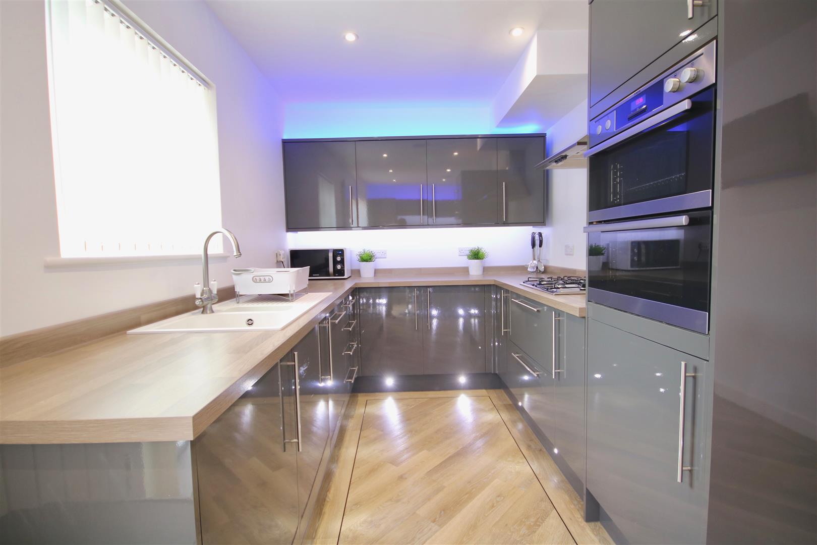 Stepping inside the property you have a very well kept, modern lounge with electric fire, which would make the perfect space to relax and unwind. The pièce de résistance of this property would have to be its stunning kitchen. Its an ultra modern space with fitted appliances, an island, inset LED lights and built in Bluetooth speakers in the ceiling. This room would make the perfect room for entertaining, with its double doors to the rear its a fantastic space to for hosting.