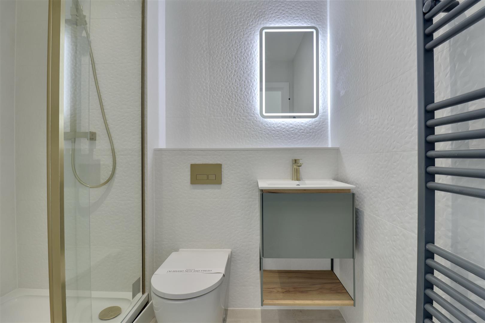 Accessed via impressive communal areas, enhanced by a striking original marble staircase, the apartment welcomes you into a bright and inviting entrance hall. The hallway benefits from generous storage cupboards and provides access to a fully fitted bathroom, finished to an exceptional standard and complete with a shower over the bath.