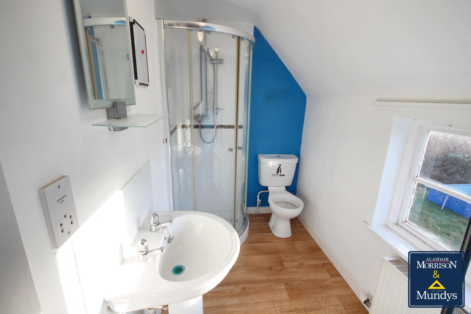SHOWER ROOM 9' 3" (into recess) x 4' 8" (2.82m x 1.42m) Fitted with a three piece suite comprising a low level WC, pedestal wash hand basin and a mains fed shower, radiator, electric shaver point and window to the front elevation.
