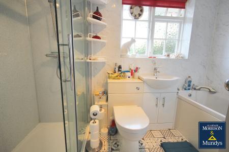 BATHROOM 9' 1" x 5' 5" (2.77m x 1.65m) Re-fitted with a panelled bath, low-level WC, wash hand basin within a vanity unit and double shower cubicle with mains fed shower, combination of tiling and water boards to walls, chrome heated towel rail and opaque window to the rear elevation.