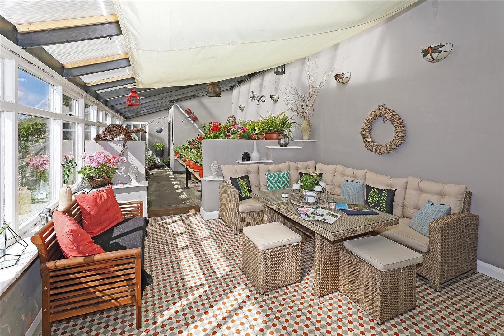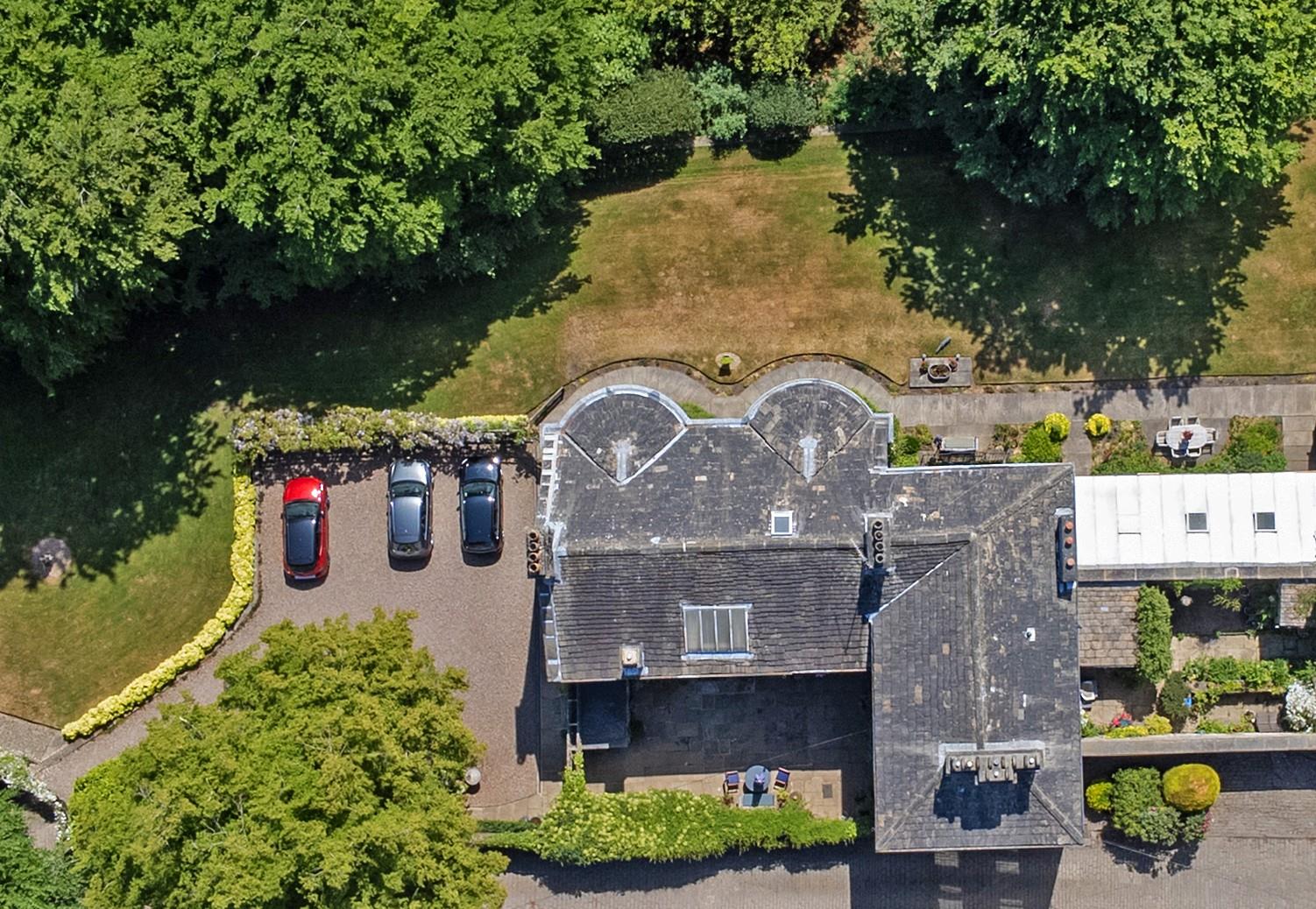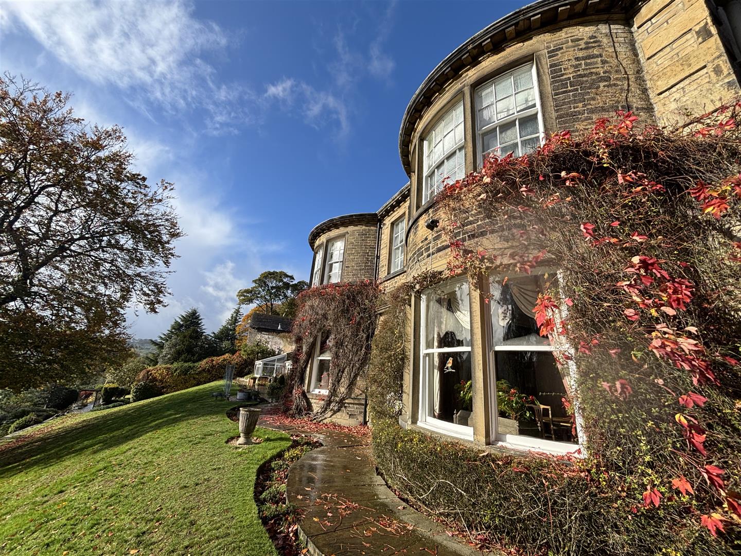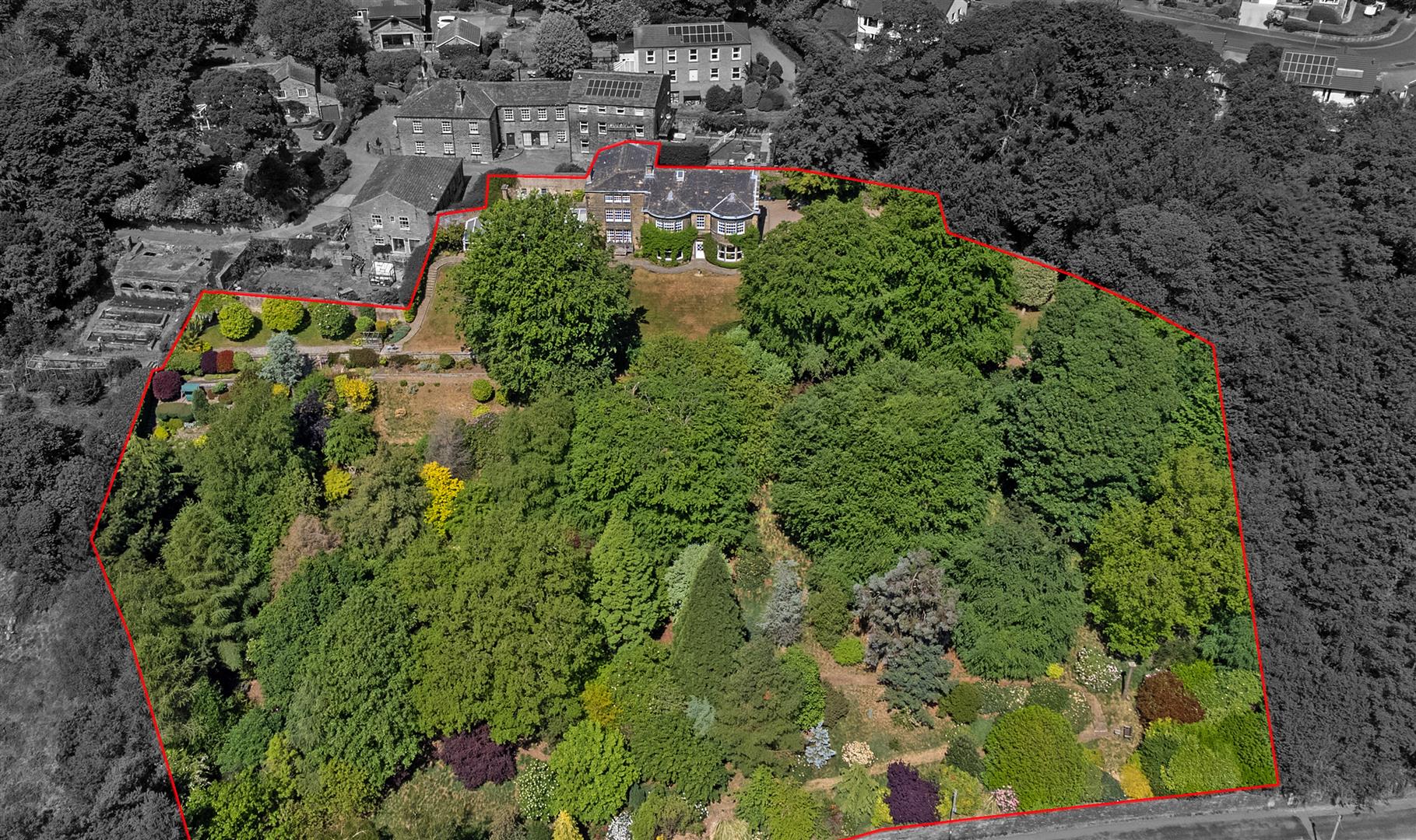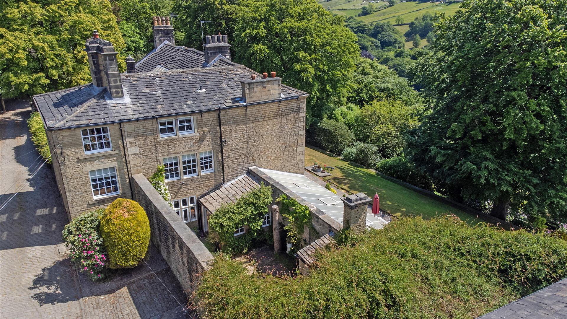 - Stone-tiered gardens, sun terrace, greenhouse, and outbuilding in a peaceful, elevated setting of approximately 2.15 acres
