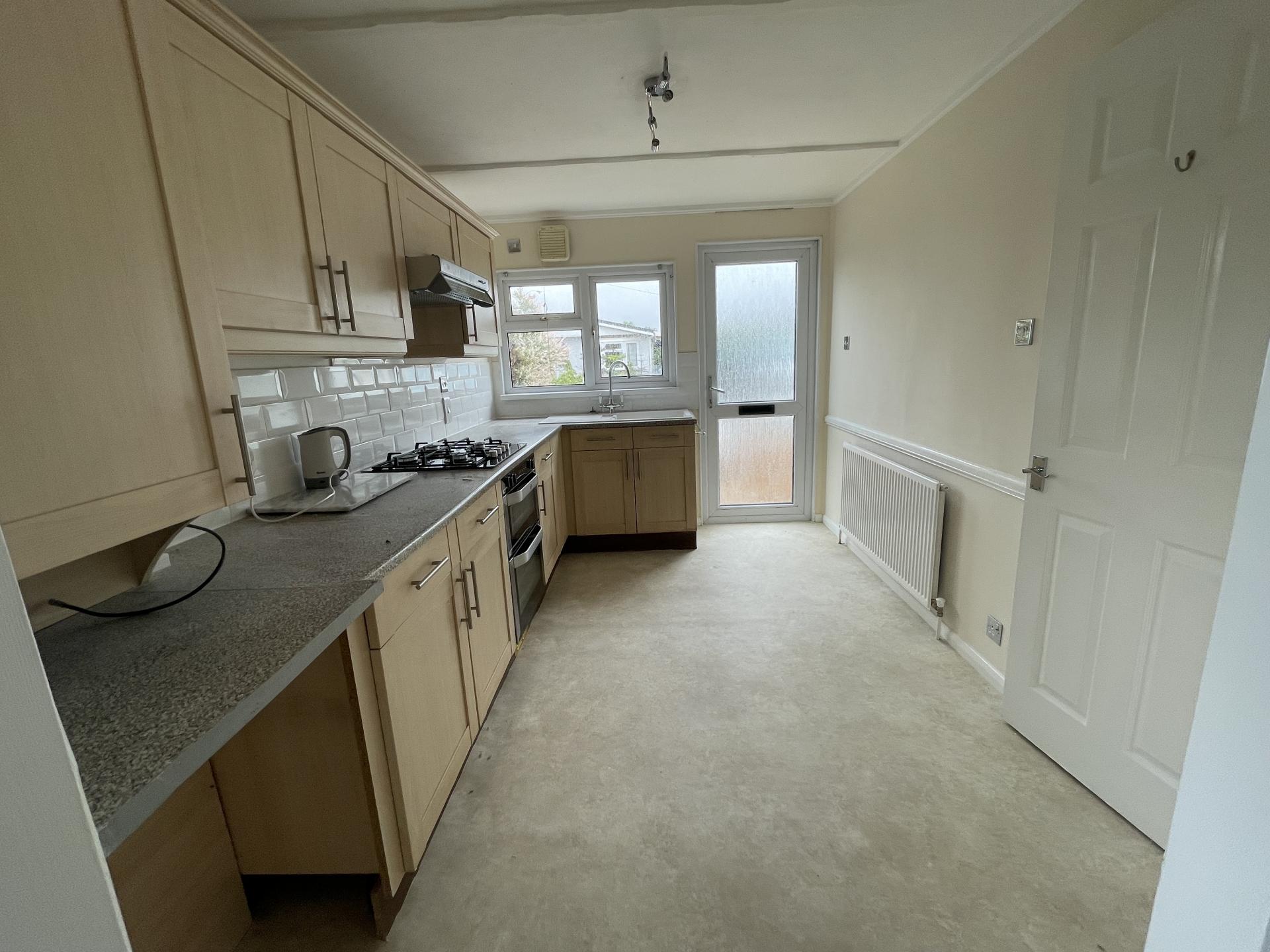 KITCHEN 2.56m(8'5") x 3.72m(12'2") UPVC double glazed window to the side elevation, spot light fitments, radiator, wide range of base and eye level units with work surfaces over, tiled splashbacks, inset stainless steel sink and taps, wall mounted Vaillant gas propane boiler fitted into cupboard, plumbing and space for washing machine, space for fridge freezer, integrated Neff gas propane hob with extractor hood over, integrated Neff electric oven, wall mounted Xpelair air extractor, door to: