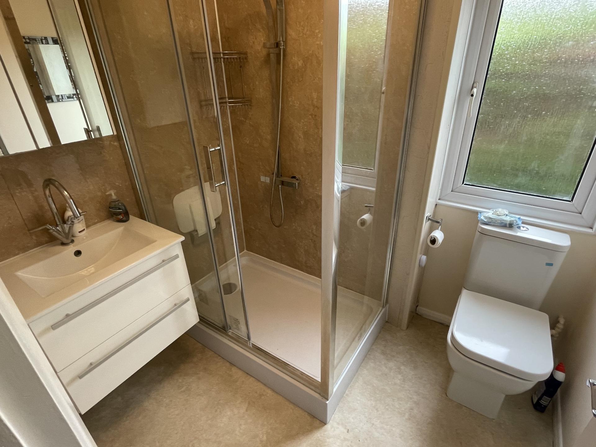 SHOWER ROOM 1.75m(5'9") x 2.05m(6'9") UPVC obscure double glazed window to the side elevation, centre light point, extractor fan, radiator, fitted with a three piece suite comprising of low level WC, hand basin fitted into vanity unit with storage below and with mirror over, fully tiled shower cubicle with fitted thermostatic shower.