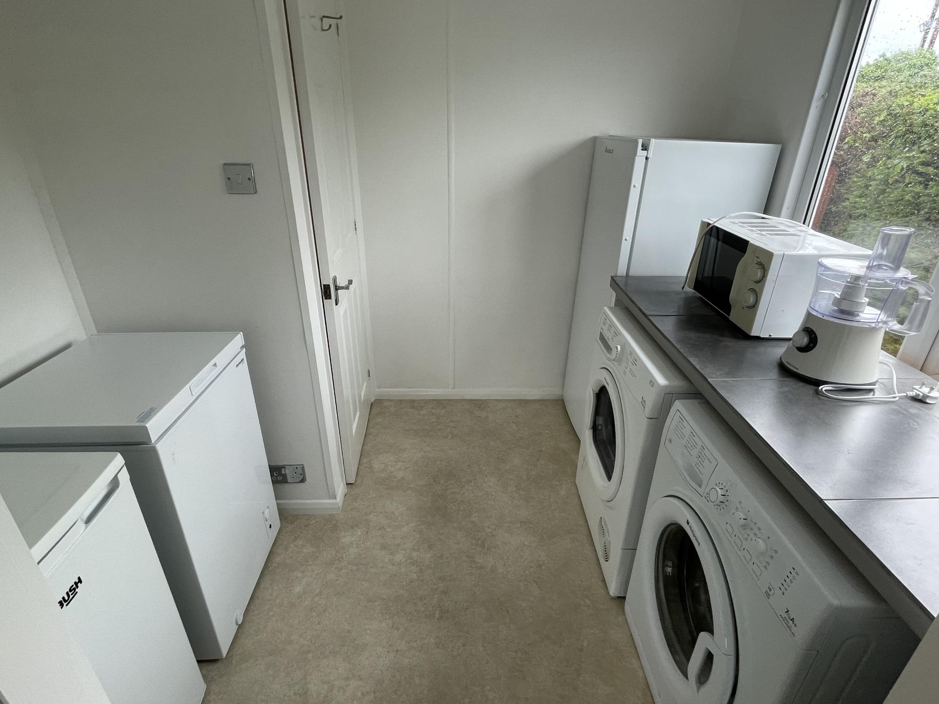 UTILITY 7' 10" x 6' 11" (2.40m x 2.12m) UPVC double glazed window to the side elevation, new spotlight fitment, appliances included (fridge, small chest freezer, washing machine, tumble dryer, larder fridge), fitted worktop, radiator, door into: