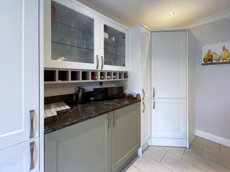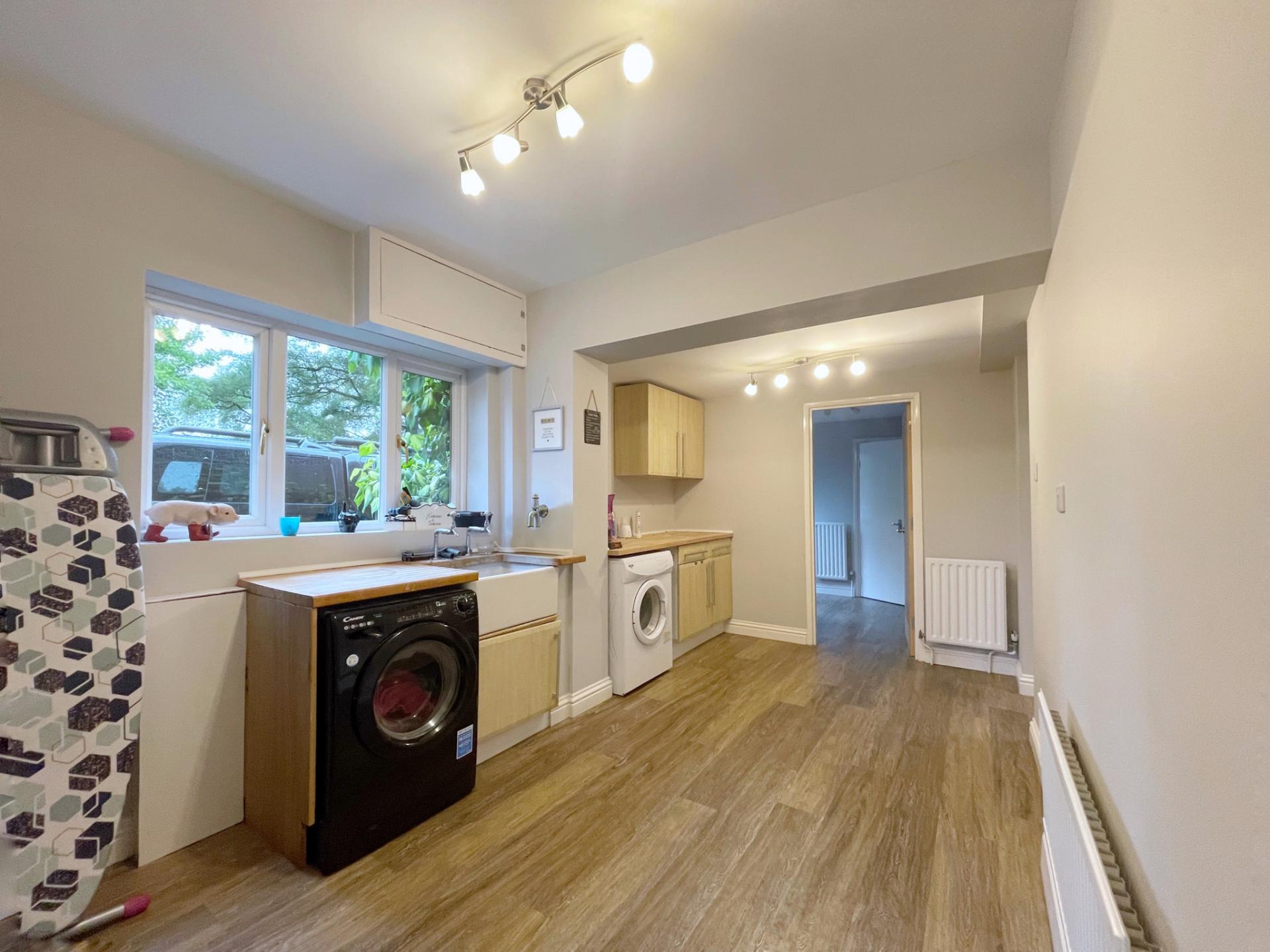 UTILITY ROOM 14' 7" x 8' 7" (4.47m x 2.64m) Fitted with a range of base units with solid wooden worktops over, Belfast sink, plumbing for washing machine, space for tumble dryer, inset spotlights, vinyl tiled flooring, nook underneath staircase allowing for ample coat storage.