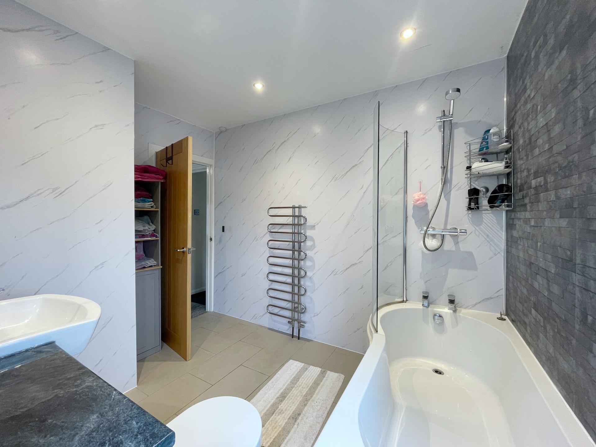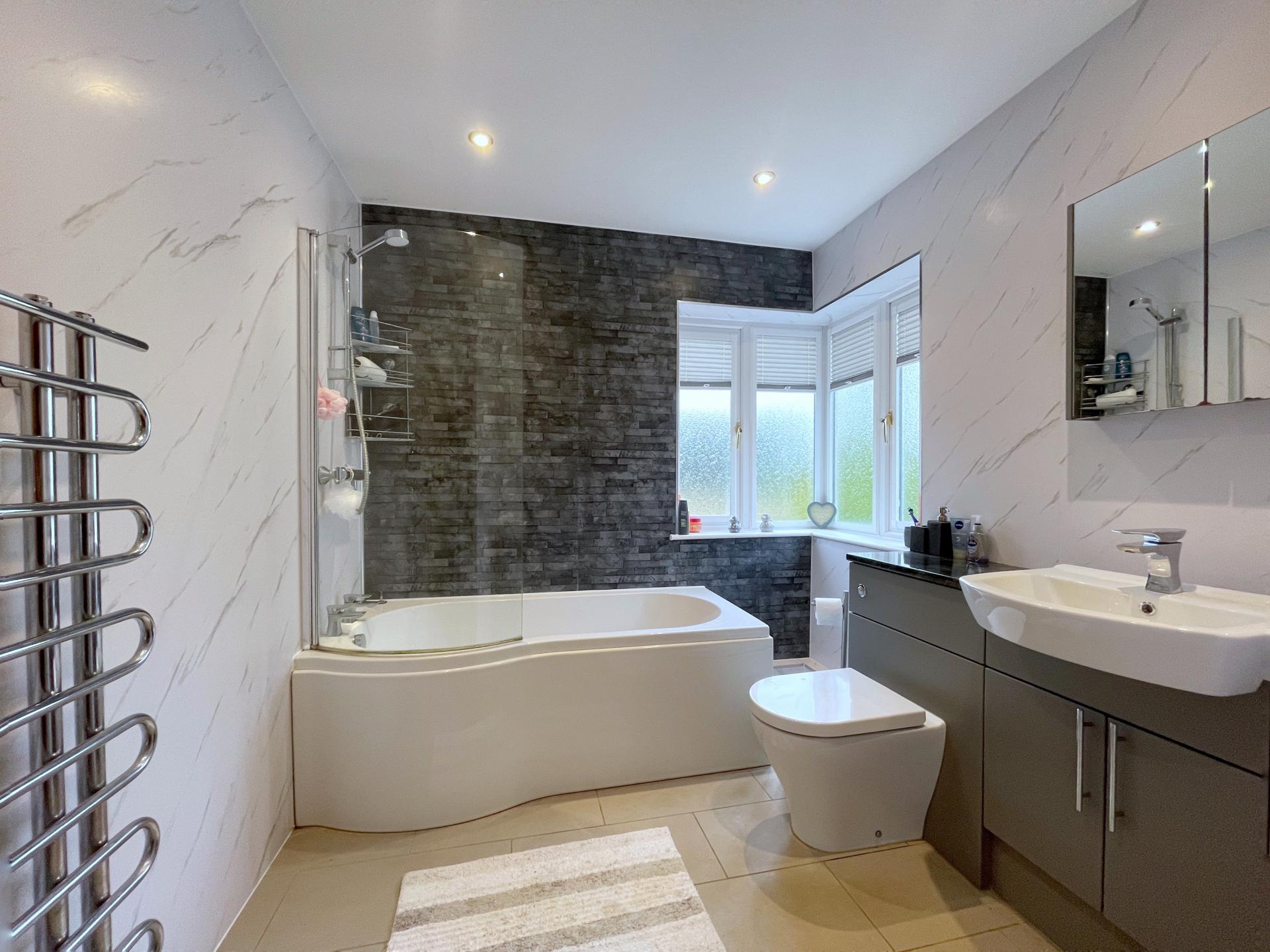 FAMILY BATHROOM Fitted with a three piece suite comprising of curved bath, wash hand basin fitted into vanity unit with storage below, low level WC, part tiled walls, heated towel rail, inset LED lighting, UPVC double glazed windows.