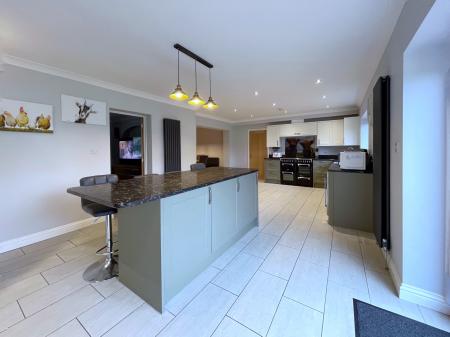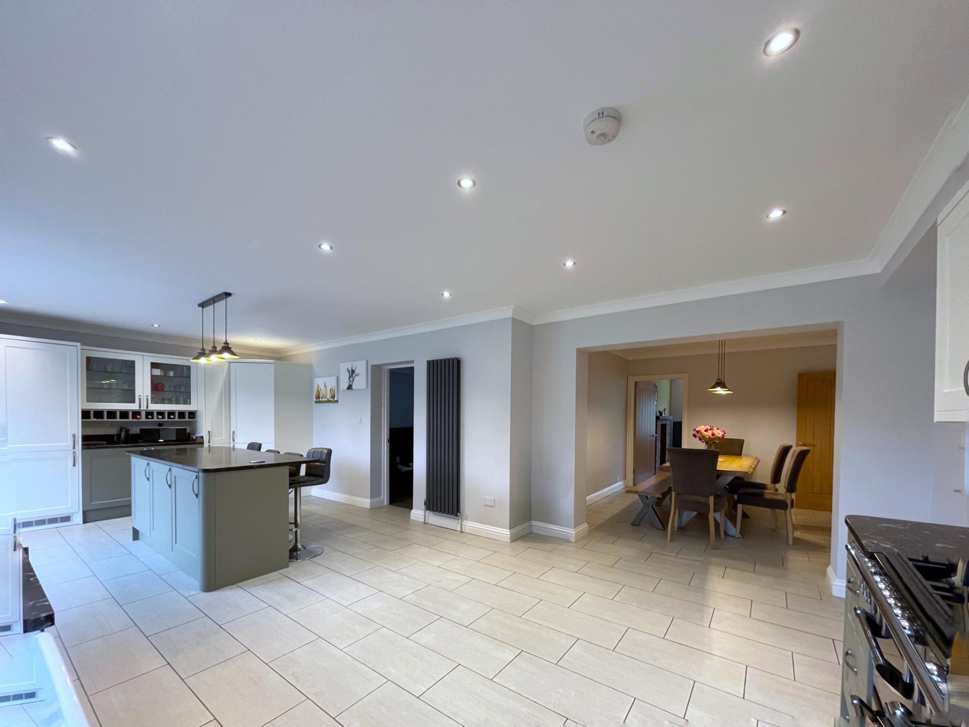 OPEN PLAN KITCHEN Superbly fitted with a wide range of base and eye level units with work surfaces over, Belfast sink, integrated appliances comprising fridge freezer, wine rack, composite built-in bin, space for Range cooker, extractor hood over, central island with lighting above, ample storage with a breakfast nook, 2 radiators, inset spotlights, porcelain vinyl tiled flooring, UPVC double glazed window, UPVC double glazed French doors leading into rear garden. Opening into: