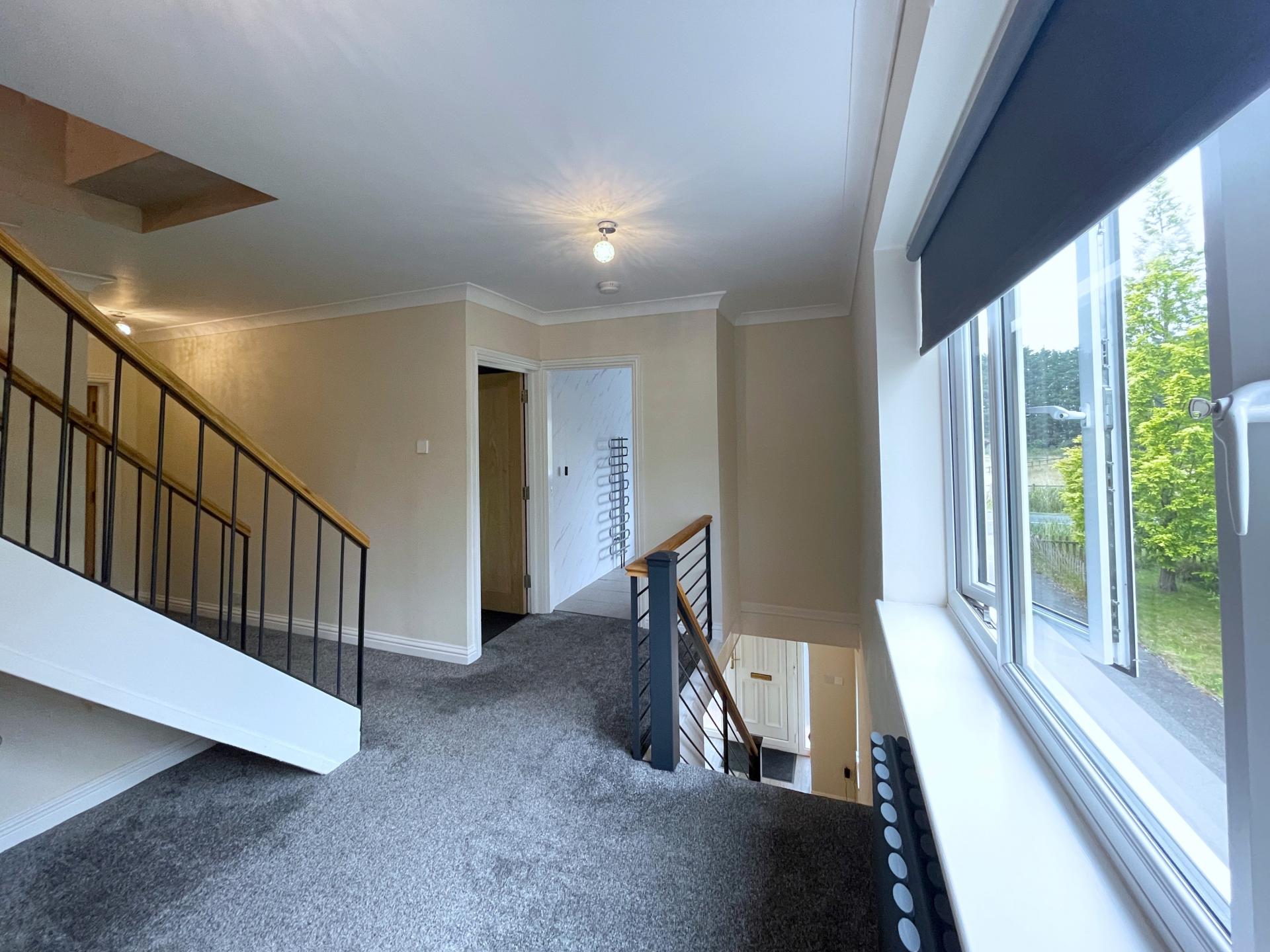 GALLERIED LANDING Radiator, staircase rising to second floor, double glazed window, door to: