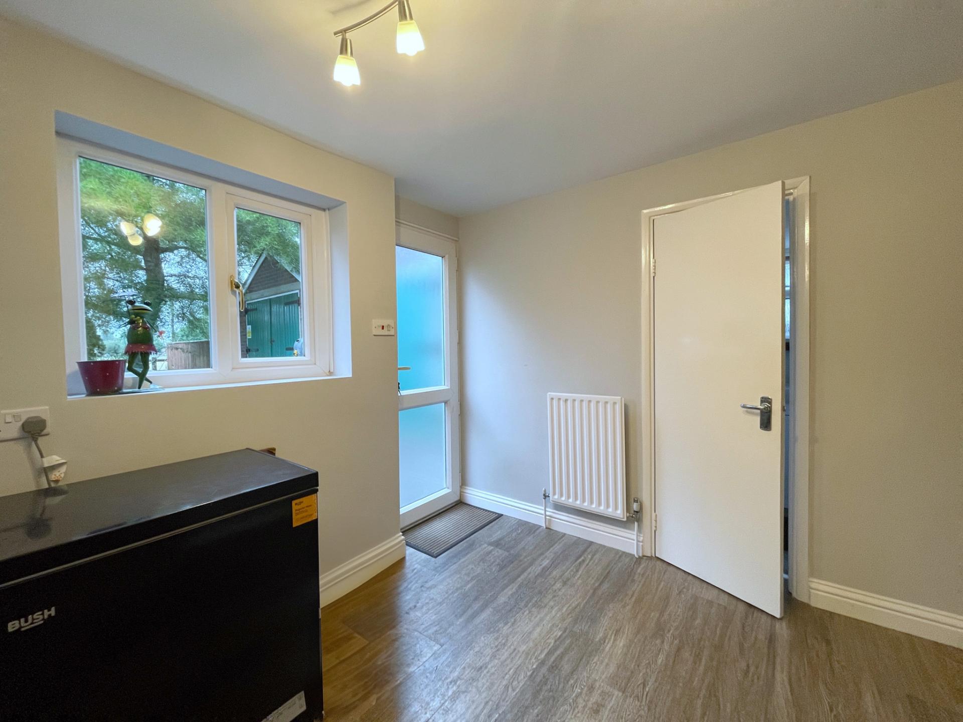 BOOT ROOM 14' 0" x 9' 3" (4.27m x 2.82m) Double glazed door into rear garden, door leading into Claokroom, radiator, vinyl tiled flooring, inset spotlights, power points and ample space for storing footwear and coats.