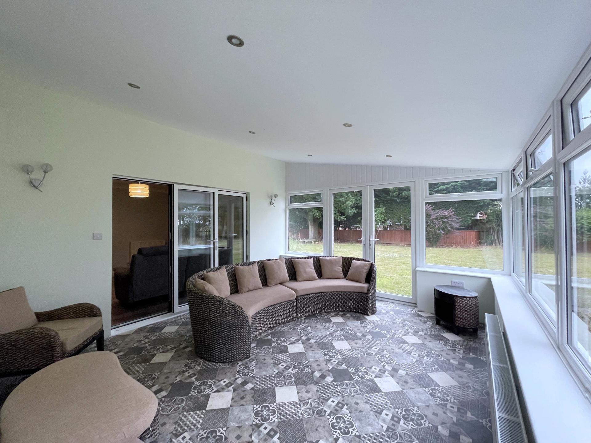 CONSERVATORY/SUN ROOM 15' 5" x 13' 1" (4.72m x 4.01m) Vinyl tiled flooring, radiator, wall lights, French doors leading into rear door.