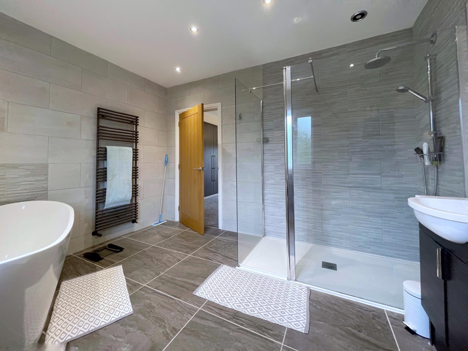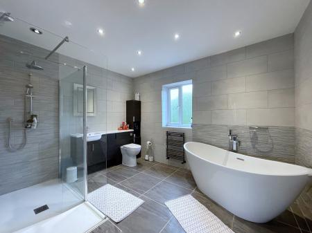 EN-SUITE Luxurious suite comprising freestanding bath, large walk-in double shower, wash hand basin and WC. Inset spotlights, radiator, heated towel rail, UPVC double glazed window.