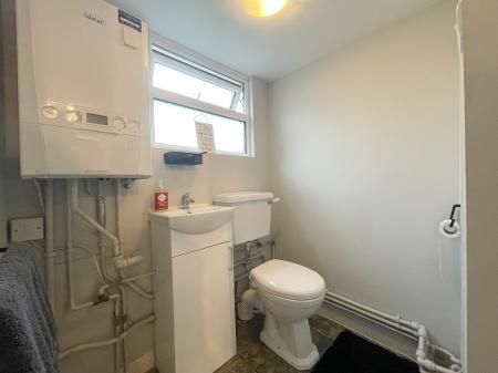 CLOAKROOM Central heating boiler, ceiling light, fitted with a two piece suite comprising wash hand basin and WC.