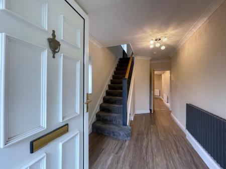 ENTRANCE HALLWAY Vinyl tiled flooring, radiator, staircase rising to first floor, door into: