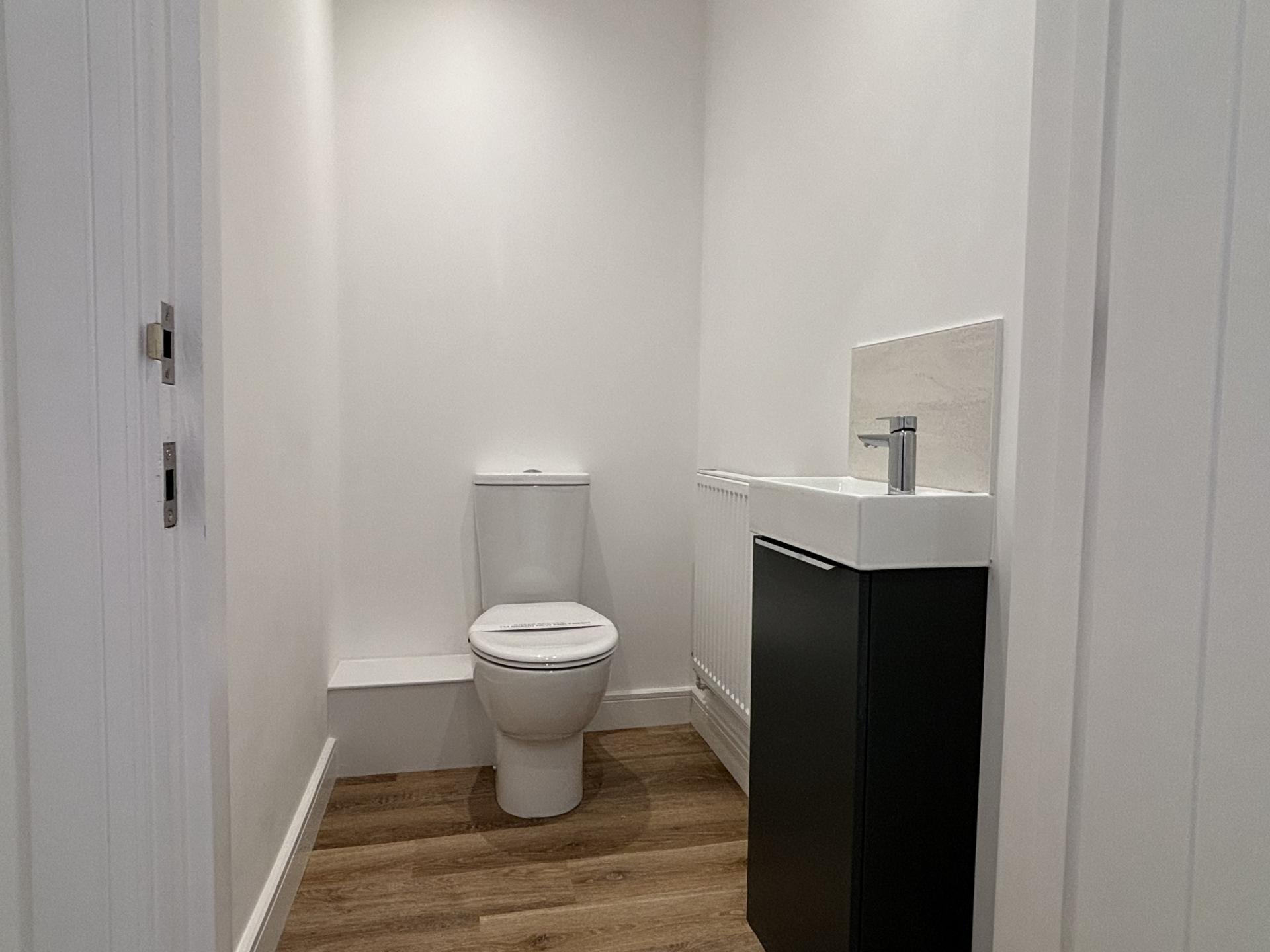 CLOAKROOM 5' 1" x 3' 8" (1.56m x 1.12m) Low level Wc and navy vanity unit with wash hand basin. Chrome Towel rail. Recessed ceiling downlights. Splashback tiling. LVT Flooring.