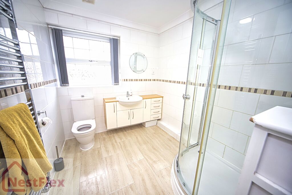3-piece suite comprising low level WC, wash hand basin with vanity unit and oversized enclosed shower cubicle. There is also a heated towel rail.