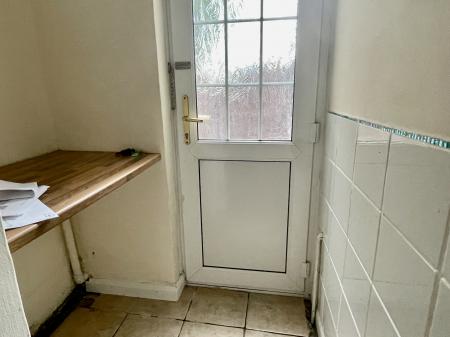 UTILITY AREA/PORCH Worktop, plumbing and space for washing machine, tiled floor, part glazed UPVC external entrance door.