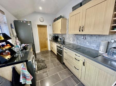 KITCHEN 8' 0" x 12' 7" (2.44m x 3.85m) With UPVC double glazed window to the side elevation, obscure UPVC double glazed door to the side elevation, vaulted ceiling with inset LED lighting, tiled flooring, double radiator, fitted with a wide range of base and eye level units with preparation surfaces over tiled splash backs with inset one and a quarter stainless steel bowl sink with mixer tap, plumbing and space for washing machine, space for fridge freezer, gas cooker point, further drawer units. Via solid oak door leading into:
