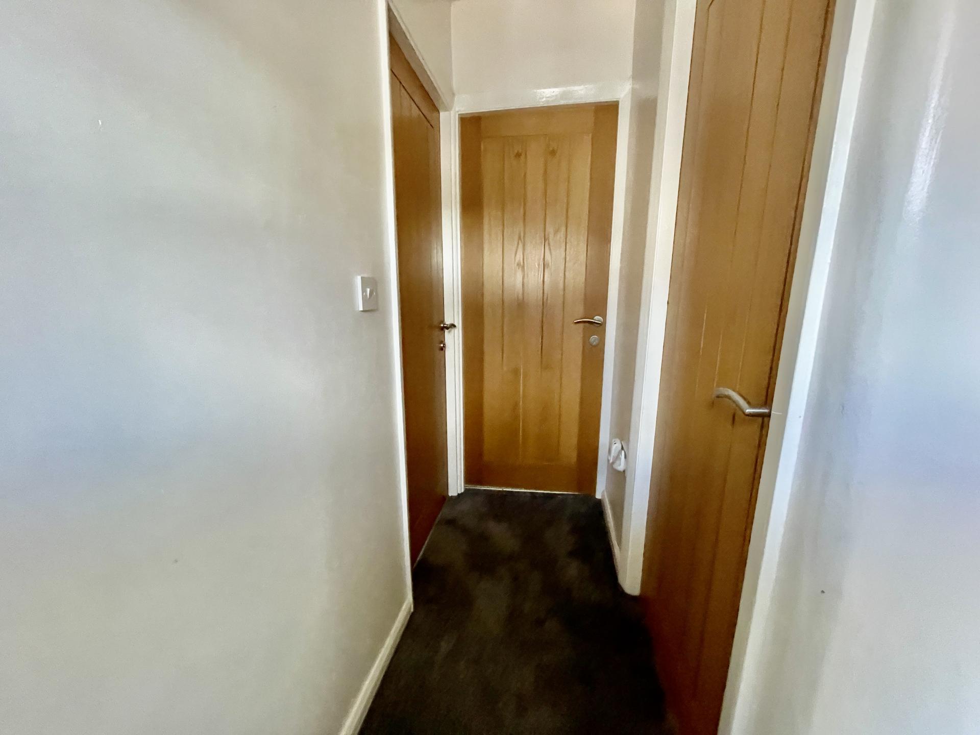 Extensive gravelled driveway and turning bay, raised shrub borders, side gated access leading into rear garden, leading up to the front door there is outdoor lighting leading to an obscure UPVC double glazed door leading into: