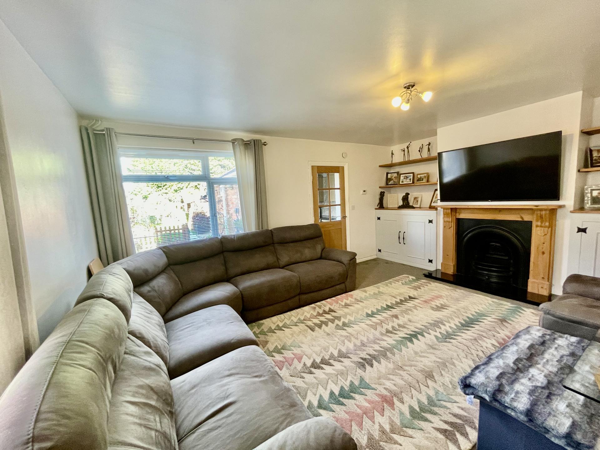 LOUNGE 13' 6" x 17' 0" (4.12m x 5.20m) With UPVC double glazed window to the side and rear elevations, skimmed ceiling with centre light point, double radiator x 2, tv point, telephone point, fitted shelving into recess, fitted bespoke cabinet into recess one housing electric meter, solid wooden fireplace with wrought iron insert and marble decorative hearth. Via part oak glazed door off leading into: