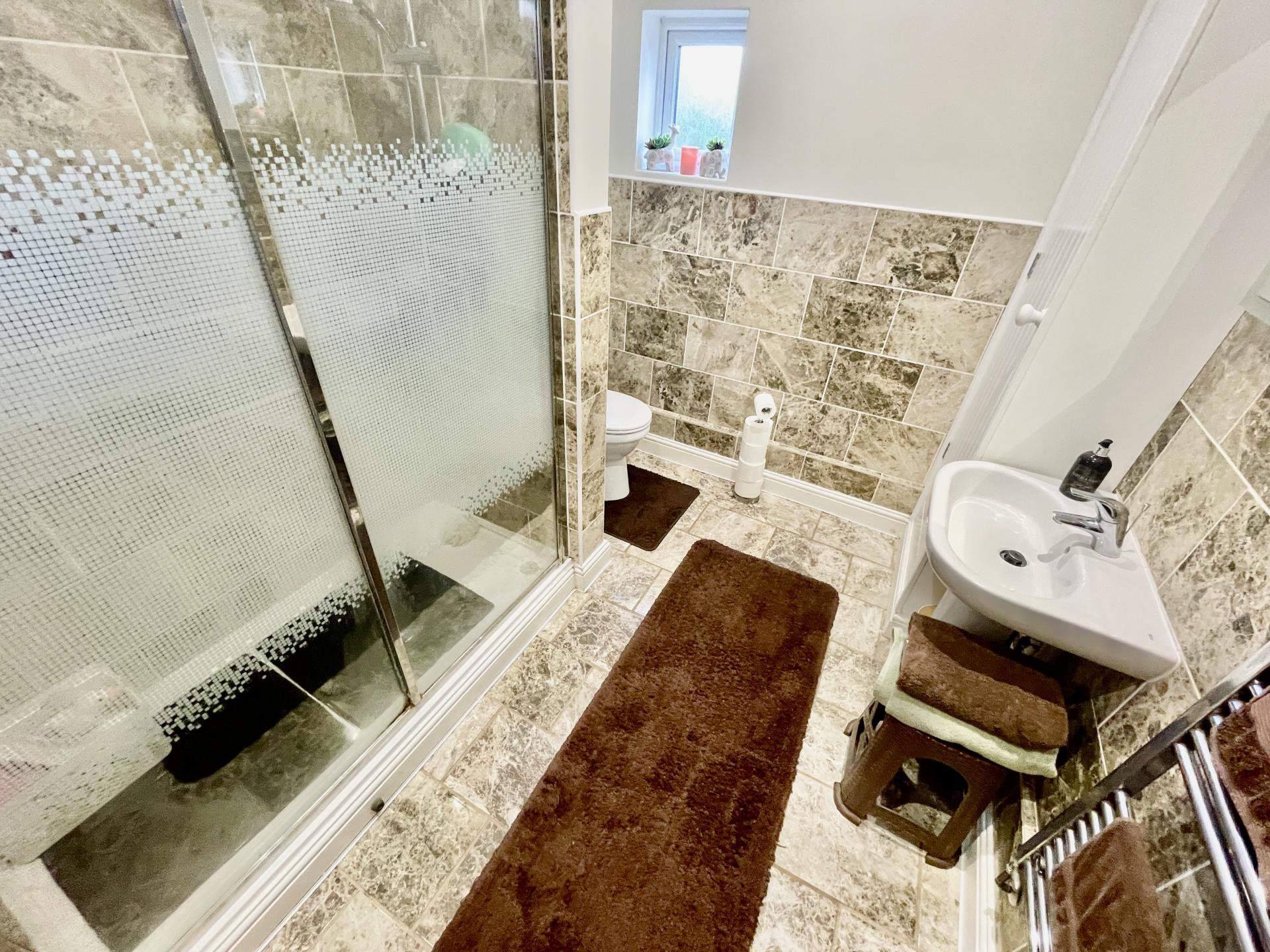 SHOWER ROOM 7' 7" x 9' 4" (2.32m x 2.85m) With obscure UPVC double glazed window to the side and rear elevations, textured vaulted ceiling with inset LED lighting, loft access, tiled flooring, part tiled walls, full tiling to shower area, full length stainless steel heated towel rail, storage cupboard off housing Ideal Logic gas boiler, fitted with a three pieces suite comprising of low level WC, pedestal wash hand basin with mixer tap, double shower cubicle with glass sliding doors with extractor fan, fitted thermostatic shower over.