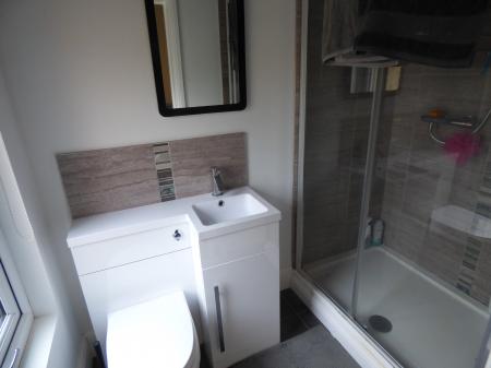 EN-SUITE SHOWER ROOM 4' 8" x 6' 11" (1.44m x 2.11m) Shower cubicle, modern moulded low level WC with hand basin and mixer tap, obscure glazed front window, radiator.