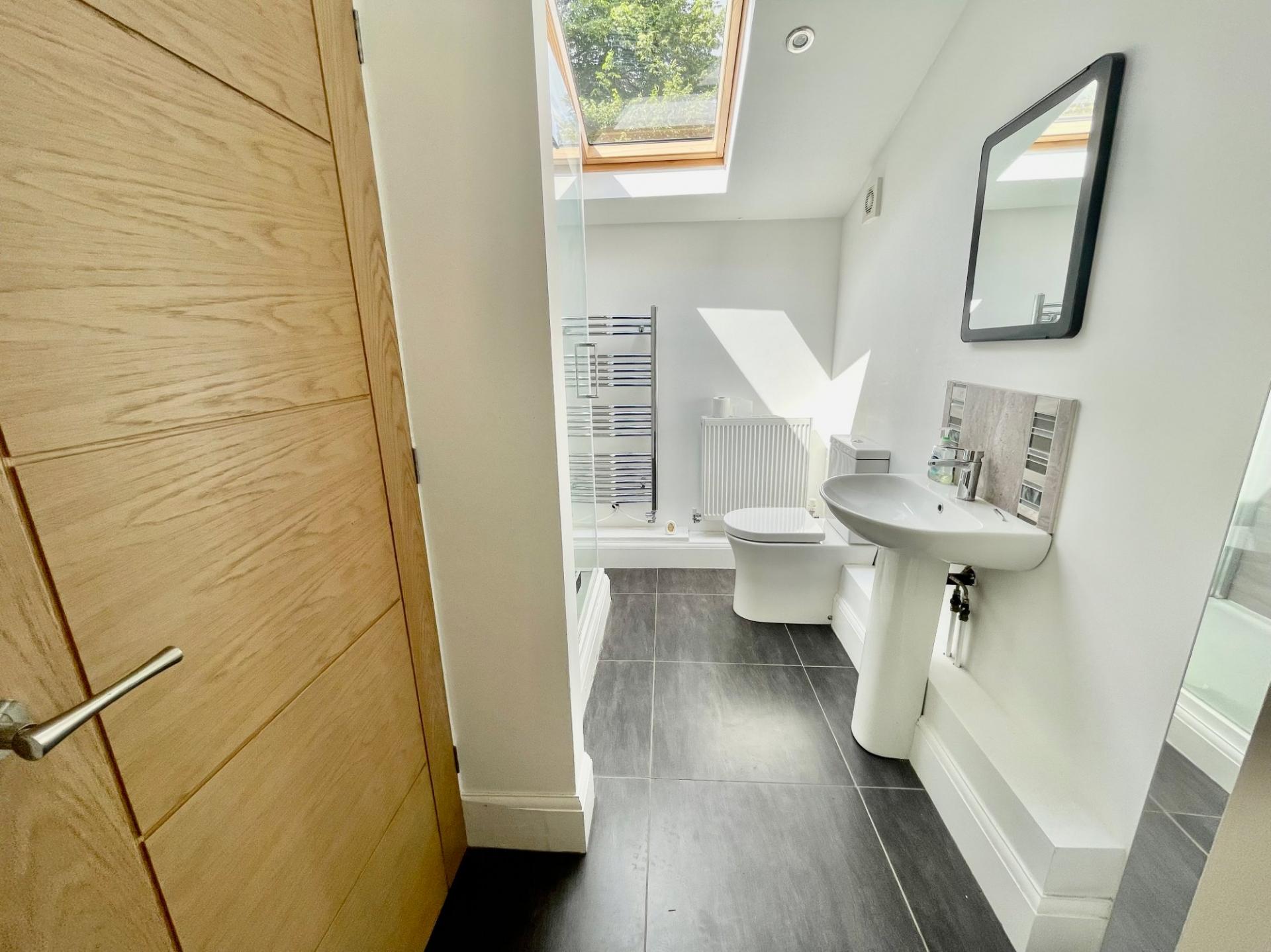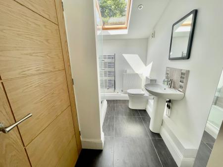 SHOWER ROOM 9' 6" x 6' 7" (2.90m x 2.03m) Large shower cubicle, low level WC, wash hand basin, radiator, Velux window, store cupboard.