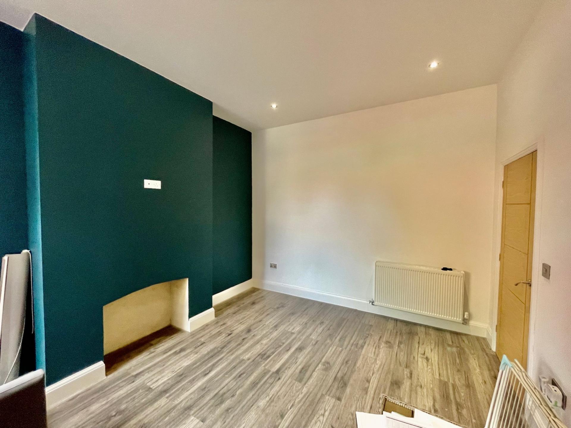 DINING ROOM 11' 9" x 13' 8" (3.60m x 4.18m) Rear window, modern laminate flooring, radiator, recessed ceiling lights, chimney breast.