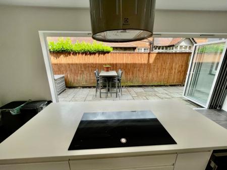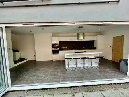 FAMILY BREAKFAST KITCHEN 25' 0" x 11' 6" (7.64m x 3.53m) Comprehensive range of modern units comprising numerous base cupboards and drawers, intermediate wall tiling, central island with breakfast bar, Neff ceramic hob and suspended cooker hood, wine rack, double bowl single drainer sink unit with mixer tap, Zanussi double oven, integrated Bosch dishwasher, integrated fridge freezer, bi-fold doors on to the patio at the side, 2 radiators, door to: