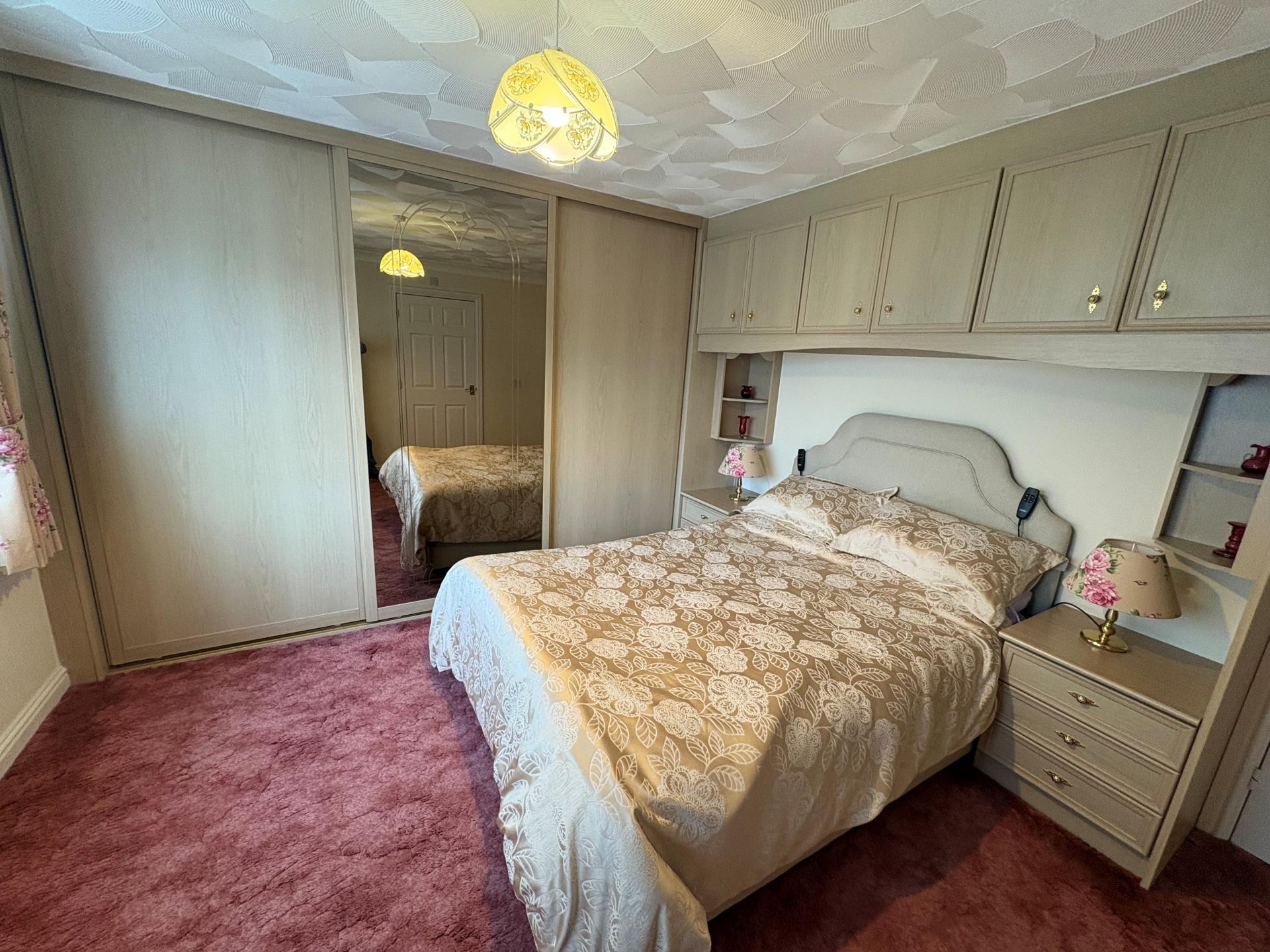 MASTER BEDROOM 11' 9" x 13' 6" (3.59m x 4.14m) Extensive range of fitted furniture comprising triple wardrobe with sliding doors and twin hanging rails (included within the room measurement), twin bedside cabinets, shelving, over bed storage cabinets, matching 6 drawer chest, coved and textured ceiling, ceiling light, radiator, UPVC window to the front elevation, door to: