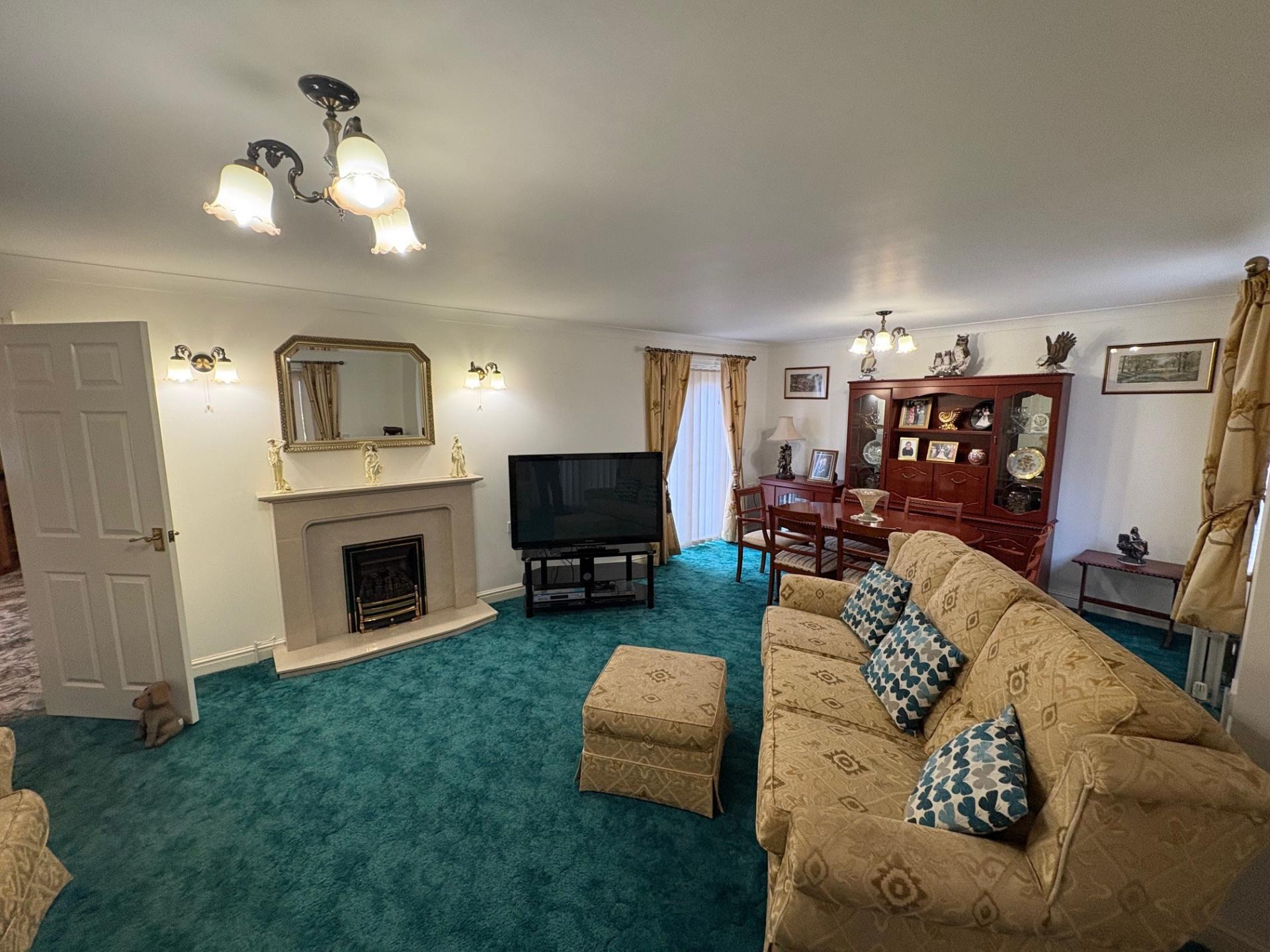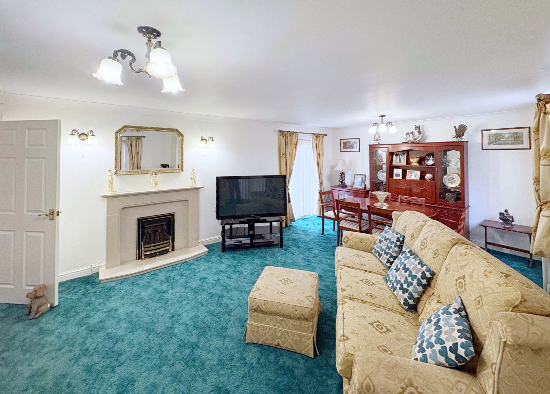LOUNGE DINER 22' 11" x 15' 2" (7.00m x 4.63m) maximum Coved cornice, 2 pendant light fitments, 2 wall lights, marble fireplace with raised hearth and coal effect gas fire, 2 radiators, TV point, UPVC window, UPVC glazed French doors opening on to the patio, pair of UPVC glazed French doors opening into: