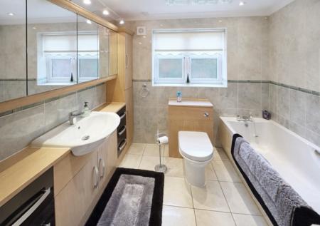 MODERN BATHROOM 7' 2" x 7' 11" (2.19m x 2.43m) Three piece suite comprising panelled bath with mixer tap and hand grips, low level WC with concealed cistern and push button flush, hand basin set within large vanity unit with multiple storage drawers and cupboards, integrated mirrors with pelmet lighting, ceramic floor tiles, fully tiled walls, vertical radiator/towel rail, obscure glazed UPVC window, recessed ceiling lights, extractor fan.