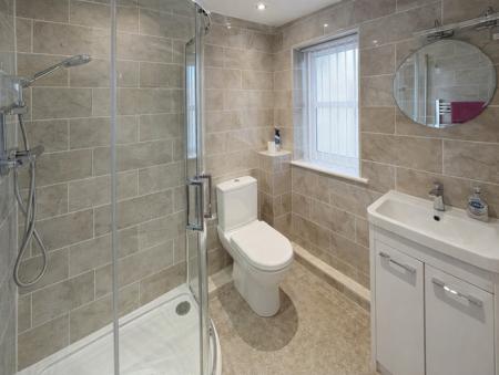 MODERN EN-SUITE SHOWER ROOM 5' 2" x 6' 3" (1.60m x 1.91m) Corner shower cabinet with fitted shower, low level WC with push button flush, hand basin with vanity storage unit beneath and mono block mixer tap, fully tiled walls, vertical radiator/towel rail, recessed ceiling lights, obscure glazed UPVC window.