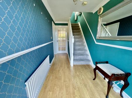 ENTRANCE HALLWAY 6' 0" x 12' 9" (1.83m x 3.91m) Coved and textured ceiling, centre light point, smoke alarm, radiator, laminate flooring, central heating controls, staircase rising to the first floor, door to: