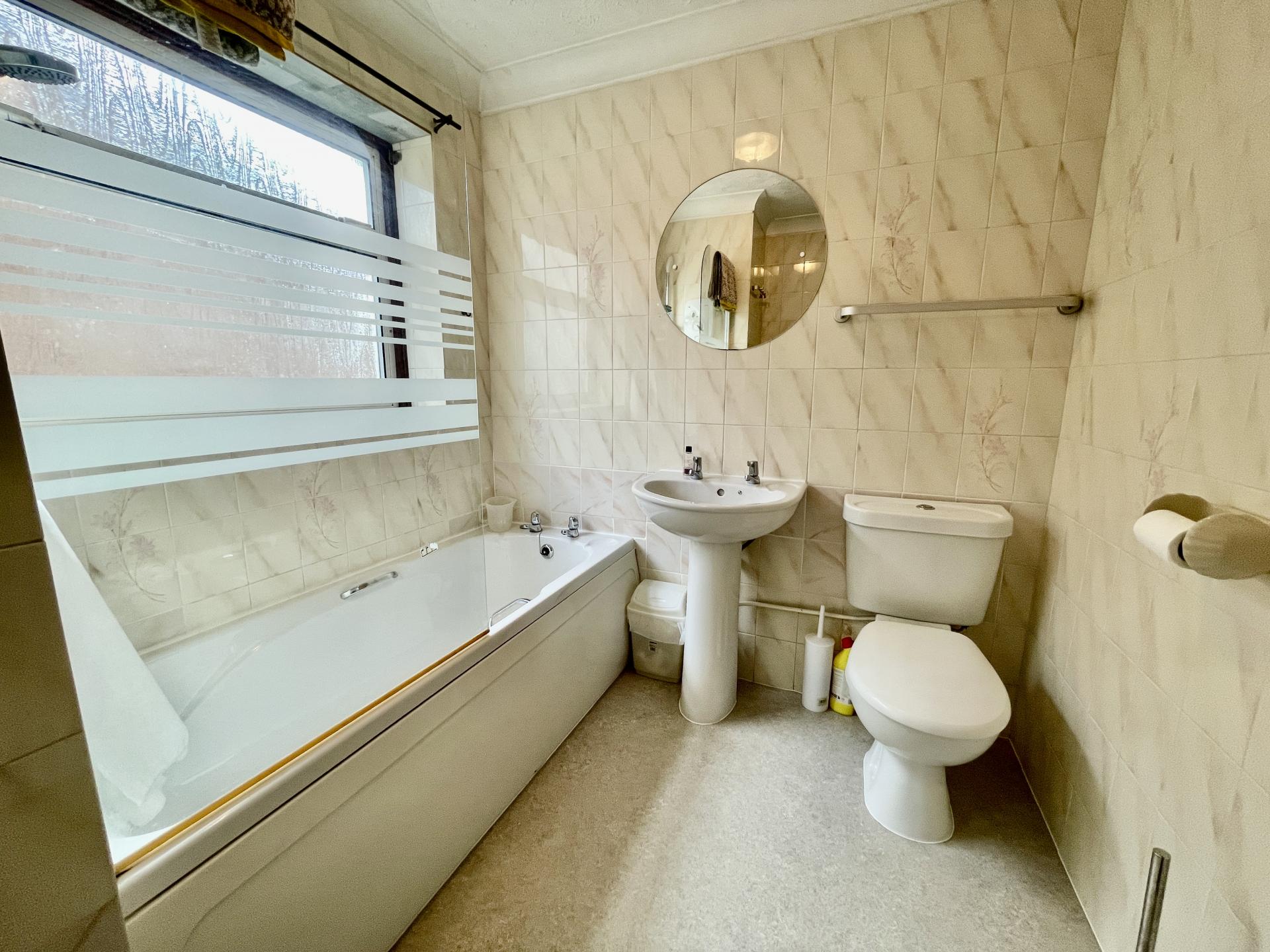 FAMILY BATHROOM 6' 10" x 7' 6" (2.10m x 2.29m) Obscured double glazed window to the side elevation, coved and textured ceiling, centre light point, fully tiled walls, radiator, vinyl floor covering. Fitted with a three piece suite comprising low level WC, pedestal wash hand basin with taps with wall mirror over, bath with taps with fitted shower screen and fitted Triton Rapid power shower over.