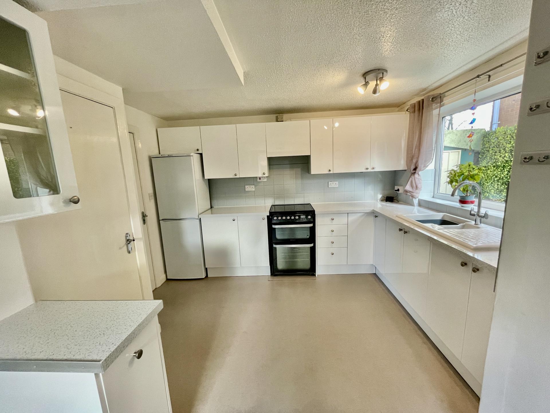 KITCHEN 8' 5" x 12' 5" (2.58m x 3.79m) UPVC double glazed window to the side elevation, textured ceiling with centre spotlight fitment, understairs storage cupboard with coat rails. Fitted with a wide range of base and eye level units with work surfaces over, tiled splashbacks, drawer units, freestanding electric Hotpoint cooker, inset enamel one and a quarter bowl sink with mixer tap, space for fridge freezer, display cabinet, opening into: