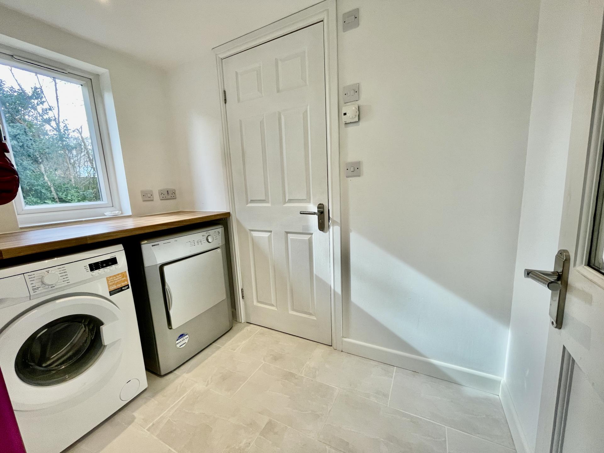 UTILITY ROOM 4' 11" x 7' 7" (1.50m x 2.33m) UPVC double glazed window to the rear elevation, skimmed ceiling, inset downlighters, smoke alarm, tiled flooring, worktop, space for washing machine, space for tumble dryer, display cabinet, central heating thermostat. Door into: