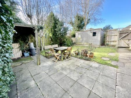 REAR GARDEN Extensive patio area, wooden workshop with power and lighting, external electric sockets.