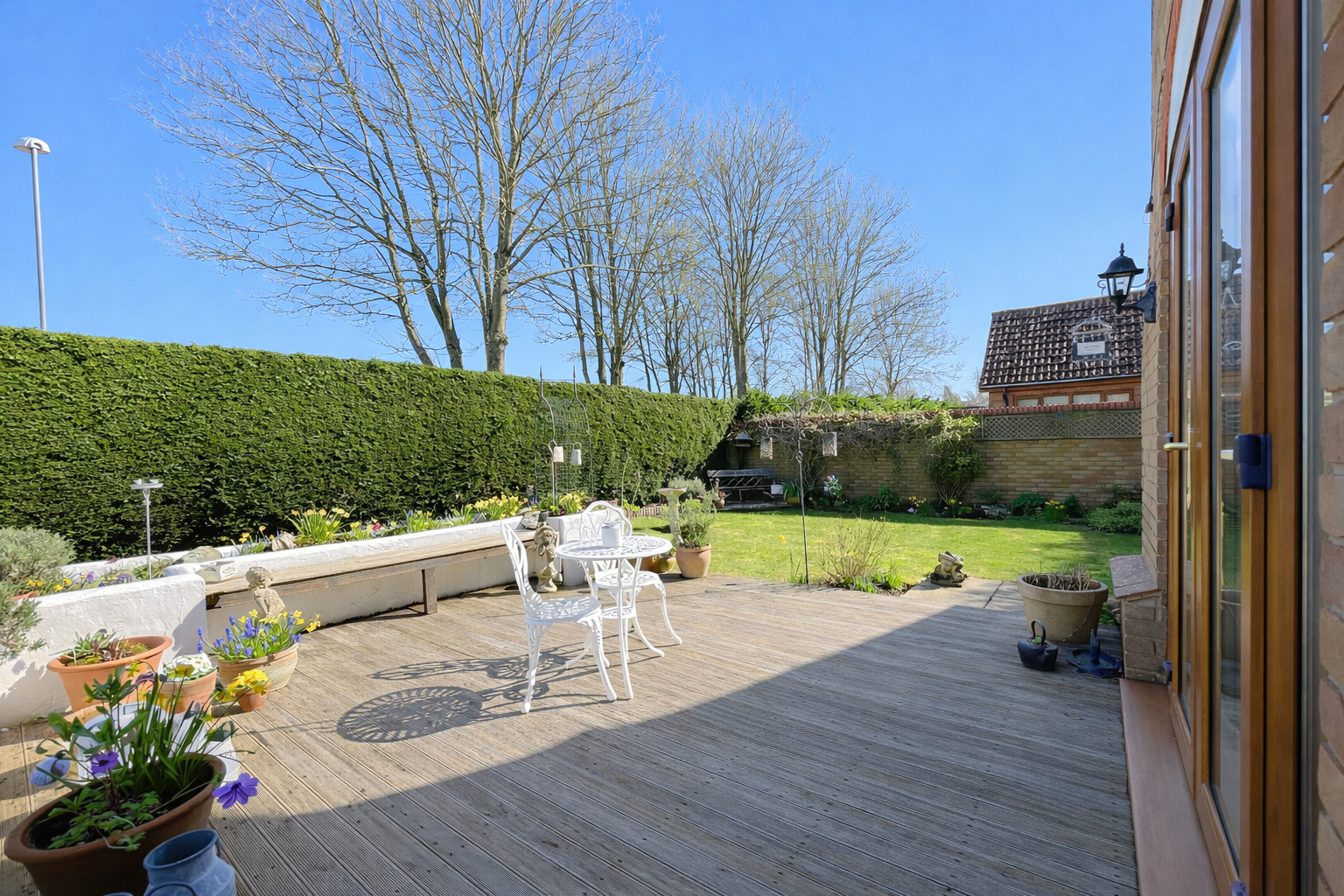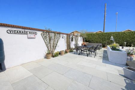 REAR GARDEN Wrought iron side gate to the rear garden with pathways, external sockets, cold water tap, patio area, raised decking area with seating, flagstone patio area, bricked walled boundaries to both sides and hedge to the rear. Extensive lighting.