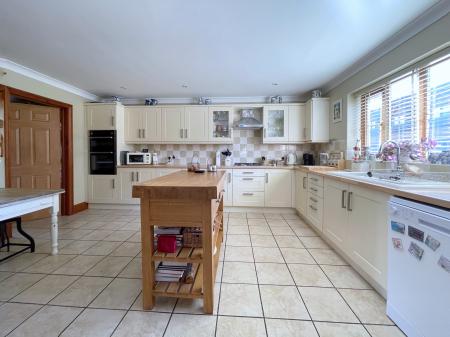 KITCHEN DINER 13' 1" x 15' 7" (4.00m x 4.77m) UPVC double glazed window to the front elevation, skimmed and coved ceiling, inset downlighters, tiled flooring, BT point, TV point, fitted with a wide range of base, eye level and drawer units with work surfaces over, tiled splashbacks, under cabinet lighting, glazed display unit, integrated stainless steel gas hob, stainless steel canopy extractor hood over, plumbing and space for dishwasher, integrated fridge freezer, inset enamel one and a quarter bowl sink with swan mixer tap, integrated eye level stainless steel fan assisted double electric oven, door into: