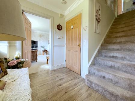 ENTRANCE HALLWAY 6' 8" x 5' 7" (2.05m x 1.71m) Skimmed and coved ceiling, centre light point, smoke alarm, alarm sensor, alarm controls, central heating thermostat, BT point, laminate flooring, staircase rising to first floor, door into: