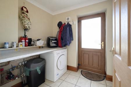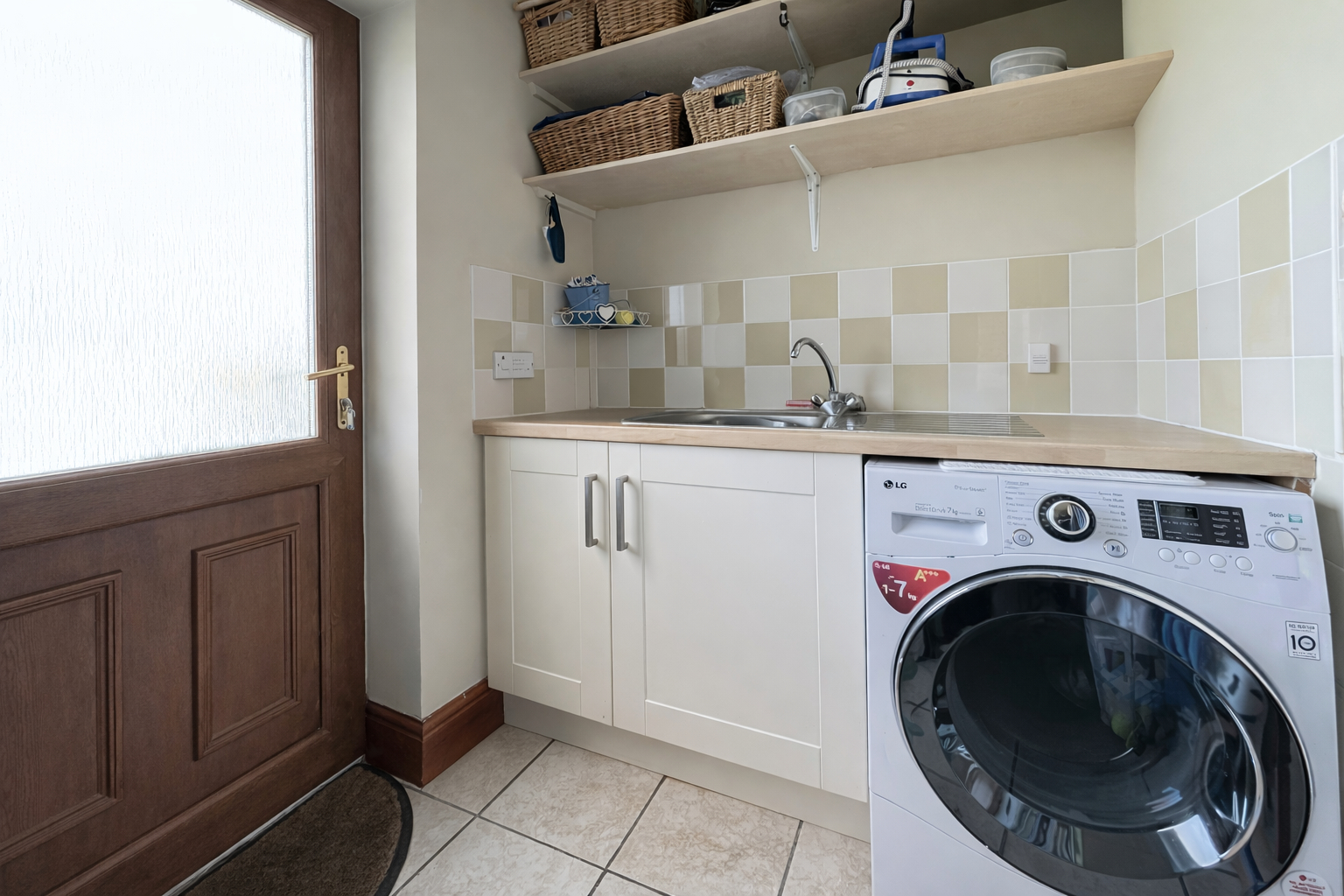 UTILITY ROOM 8' 7" x 6' 0" (2.62m x 1.83m) Obscured UPVC double glazed door to the rear elevation, skimmed and coved ceiling, centre light point, extractor fan, coat rail, tiled flooring, under floor heating controls, fitted with a range of base units with work surfaces over, tiled splashbacks, inset stainless steel sink with mixer tap, plumbing and space for washing machine, shelving, space for tumble dryer.