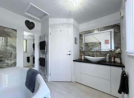 FAMILY BATHROOM 8' 8" x 8' 7" (2.66m x 2.64m) Graphite obscured UPVC double glazed window to the rear elevation, skimmed ceiling, centre light point, access to loft space, extractor fan, shaver point, heated towel rail, laminate flooring, storage into eaves, fitted with a two piece suite comprising oval bath with swan mixer tap, oval inset sink fitted into vanity unit with mixer tap and mirror over.