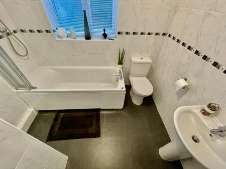 FAMILY BATHROOM 6' 10" x 7' 10" (2.10m x 2.40m) Obscured UPVC double glazed window to the rear elevation, skimmed ceiling, centre light point, access to loft space, fully tiled walls, medicine cabinet, stainless steel heated towel rail, fitted with a three piece suite comprising low level WC, pedestal wash hand basin with mixer tap, bath with mixer tap with fitted thermostatic shower over and screen. Storage cupboard off housing hot water cylinder with slatted shelving.