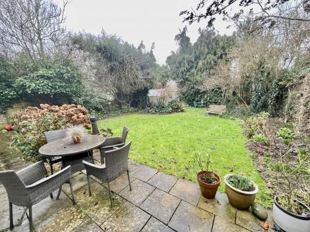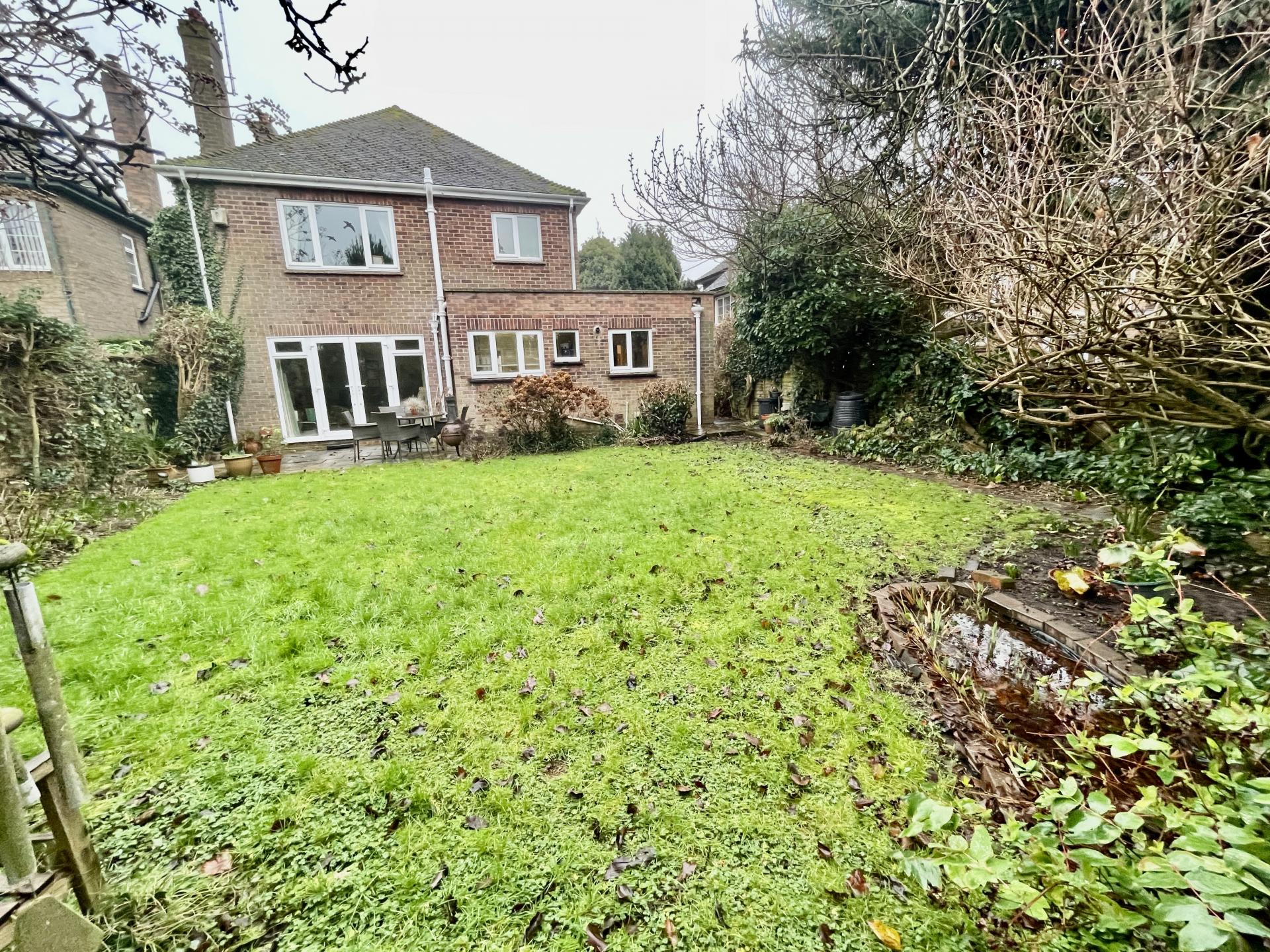 REAR GARDEN Extensive patio area, cold water tap, the garden is mainly laid to lawn with mature shrub and tree borders, wooden garden shed, glasshouse, small pond.