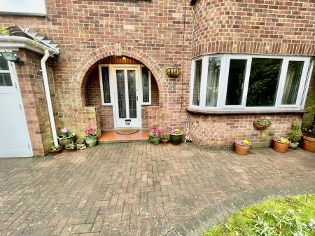 EXTERIOR Hedged boundaries to the front and side with lawned front garden with mature shrubs and trees. Extensive block paved driveway and pathways. Wooden access gate to the side leading into rear garden. Flood lighting.